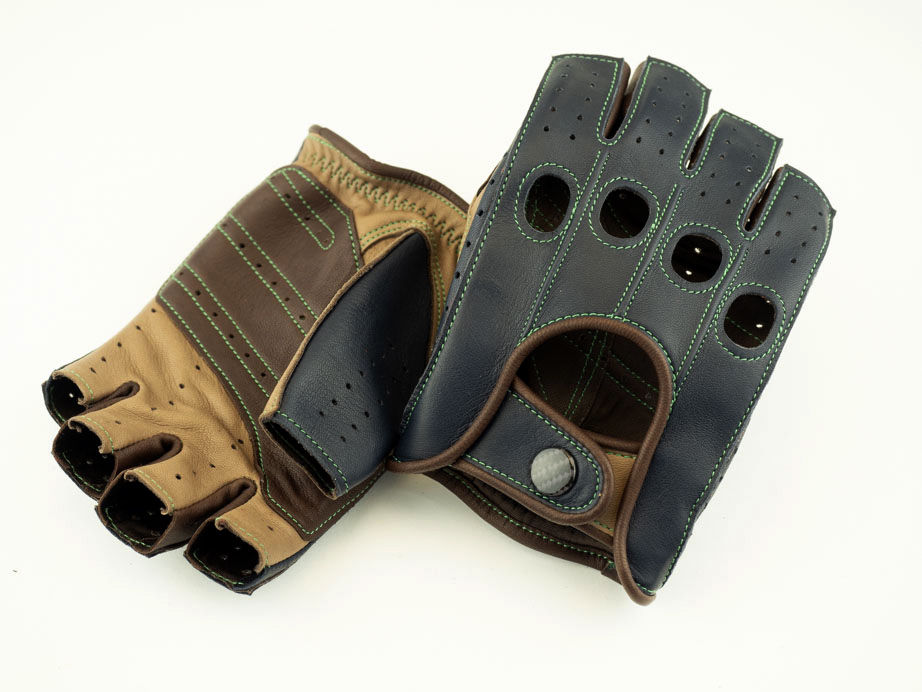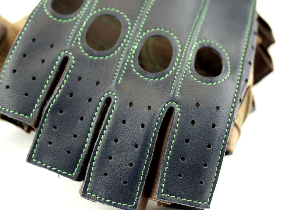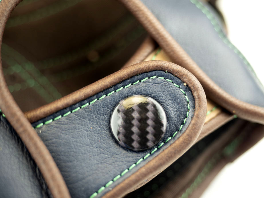 ネイビーブルー×サンドベージュ×チョコブラウンの革3色を使い、グリーンのステッチで縫い上げてみました。