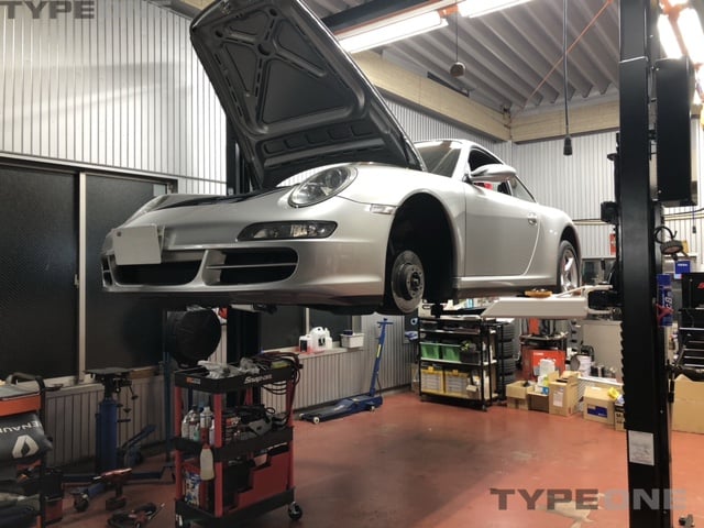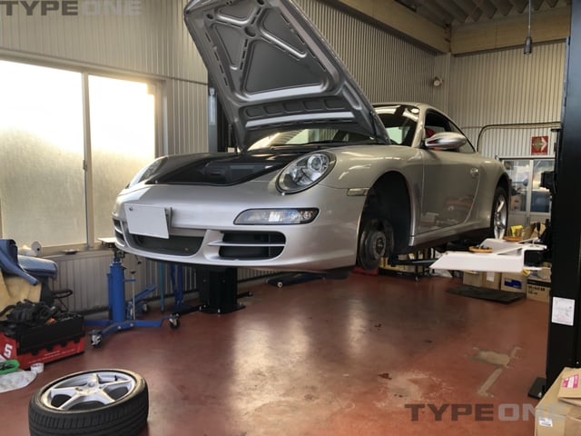 997は整備内容が決まって作業開始です。フロントのバンプラバーが完全崩壊しているので交換します。左右のアブソーバーを外して分...