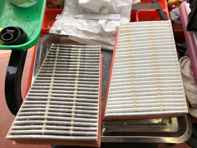 いつも大変お世話になっております。サービスの青木です。上の写真はエアコンフィルターです。上側は未使用のもの下側は使用後のもの...