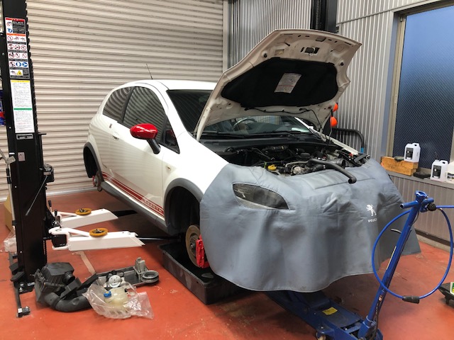 GRANDEPUNTOも車検整備中~タイミングベルト交換開始です。事前に冷却水回路のクリーニングをしておきましたのでサーモハ...