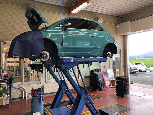 🇮🇹FIAT500Anniversarioは点検にてご入庫。オイル交換くらいで大きな問題はなさそう。白いホイールは念入り...