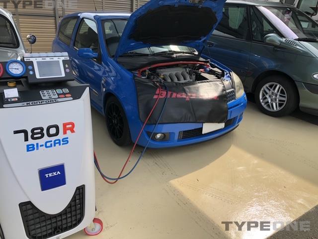 🇫🇷CLIOⅡRS182車検整備開始です。リフトの関係上、先にエアコンメンテナンスを実施。ドライブベルトを交換するのにも...