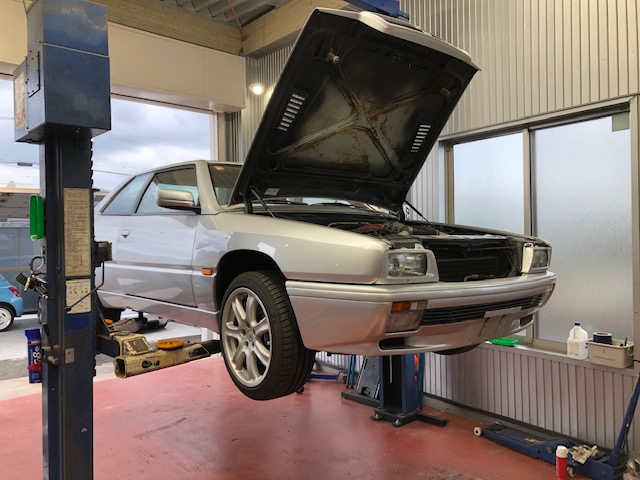 NEW社用車MASERATIGHIBLI車検を受ける為受け入れ作業中です。リアのナンバー灯やマフラーマウントなど国内欠品です...