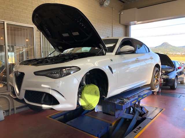 ALFAROMEOGIULIA新規検査に向けて改善作業実施中~フロントのナンバーステーがバックオーダーですが到着の目処がたっ...