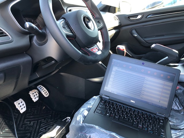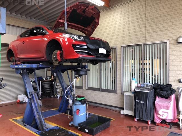 RENAULTMEGANEⅢRS車検整備開始です。エンジンオイルやクーラントの交換、ブレーキパッドもお客様の方でご用意頂きま...