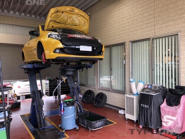 RENAULTCLIOⅢRS200車検整備開始です。エンジンオイル、ブレーキオイル、クーラントなどの油脂類やエアフィルター、...