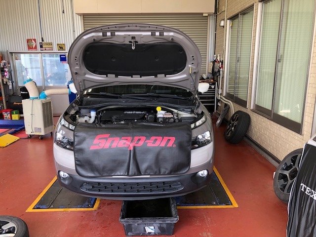 CITROENc4CACTUS車検整備開始です。エンジンオイル/フィルター、クーラントの油脂類と消耗品のエアコンフィルター、...