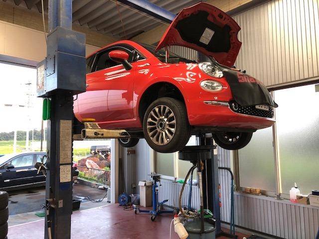 FIAT500車検入庫車両です。継続前にできる所だけでも進めておきます。油脂類のエンジンオイル/フィルター、クーラント交換を...
