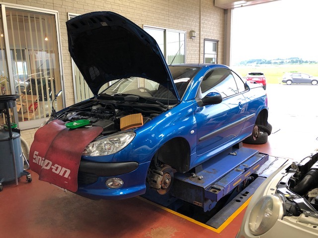 PEUGEOT206cc車検にてご新規様のご入庫です。まずはいつも通り全体チェックからスタートです。このまま継続検査は無理で...