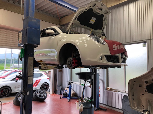 ALFAROMEOMITO車検整備開始です。油脂類のエンジンオイル/フィルター、ブレーキオイルと消耗部品のスパークプラグ、エ...