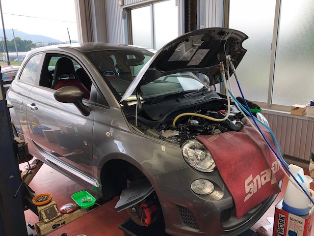 FIAT500車検整備開始です。ウィークポイントのサーモハウジングは漏れが発生していたので交換させて頂きました。ヒーターパイ...