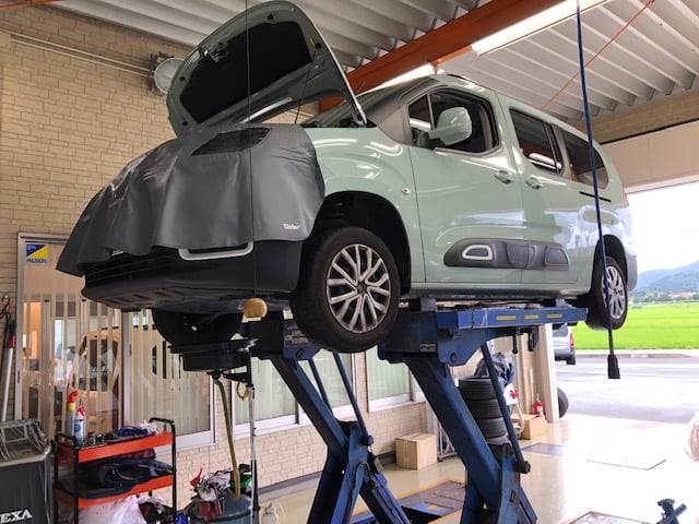 BERLINGOⅢ×2アクアブルーはオイル交換と自社でホワイトペイントホイールとサマータイヤの組み付けでご入庫です。塗装部を...