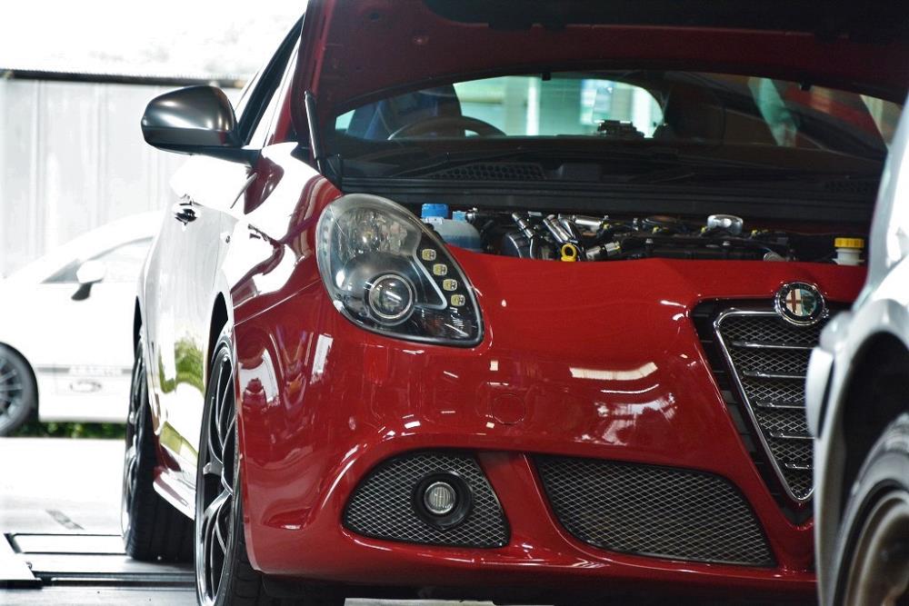 名古屋市のN様のアルファロメオミトの入庫ですタイミングベルト交換とタイヤ交換のご依頼です。走行は67000km台で、一度もタ...