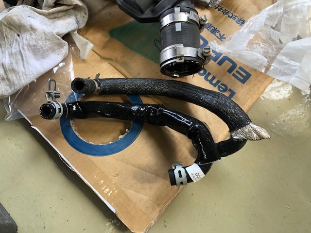 308の続き補助ウォーターポンプとオイルフィルターブラケット間のホース交換を追加で作業です。オイル漏れ等でホースが膨張してお...