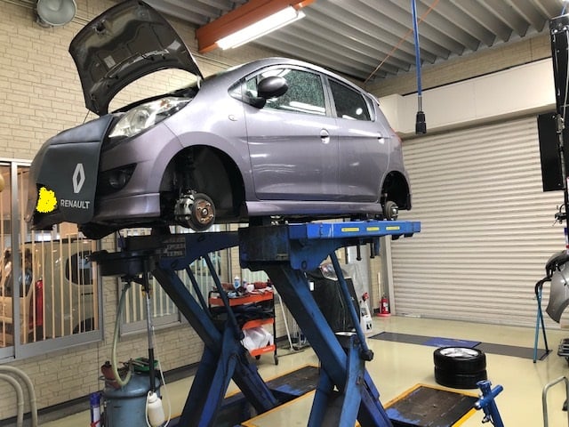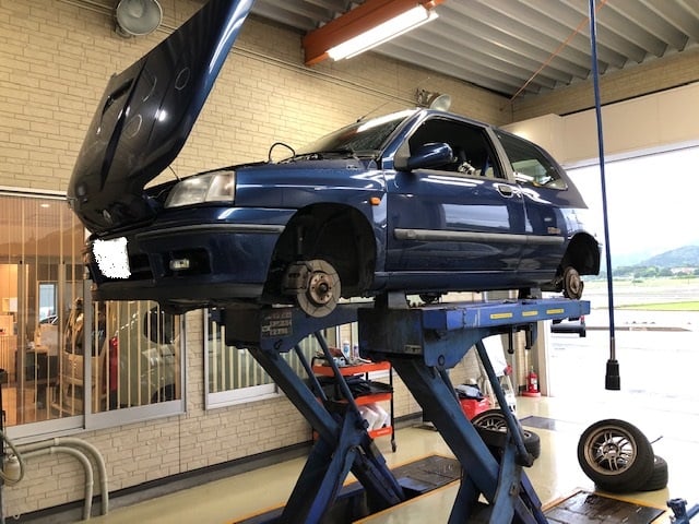 CLIO1Williamsは車検にてご入庫です。全体チェックからスタートです。タイミングベルトの目視点検ですがロアのカバーを...