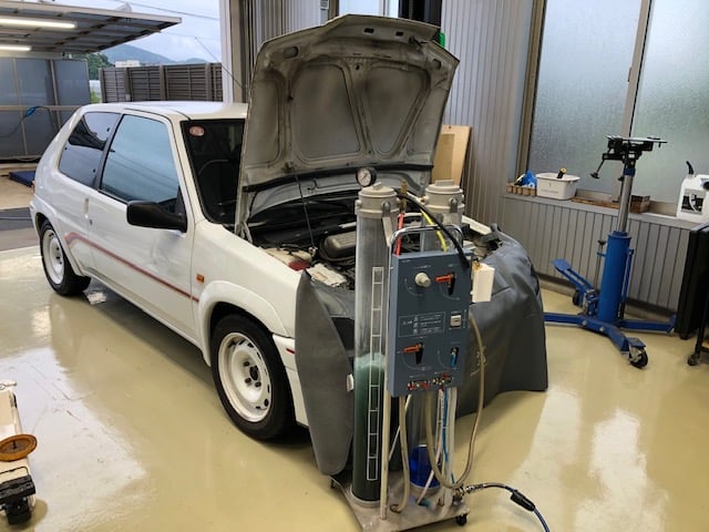106RALLYEの続きタイミングベルト関連の作業をするのであらかじめクーラントの回収、洗浄をしておきます。リフトアップして...