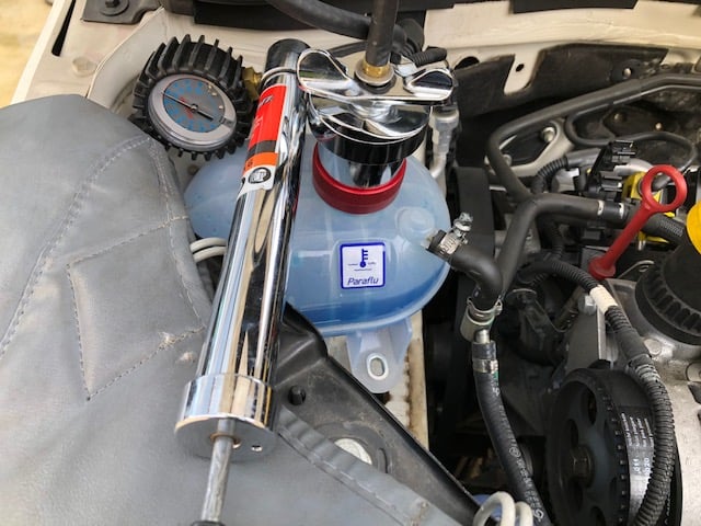車検入庫の500全体チェックからスタートです。加圧テストするとヒーターホースからポタポタ漏れてきます。ホースバンドを交換して...