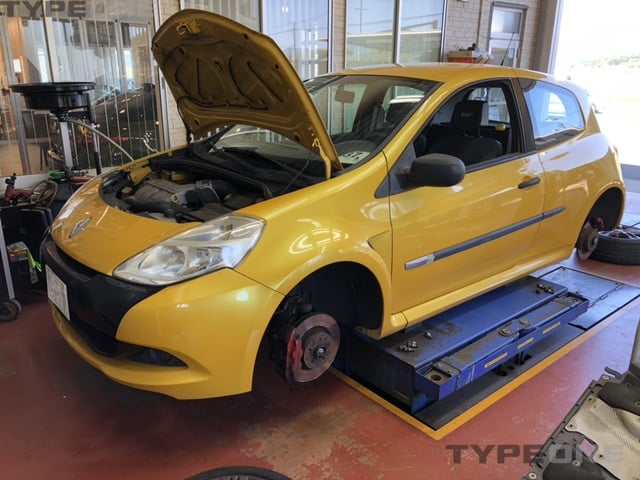 CLIOⅢも車検入庫です。まずは全体チェックからスタートです。タイミングベルトの目視点検をするのには結構外さないといけません...
