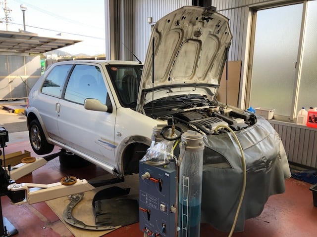 106RALLYEは車検整備の続き。クーラントの回収などしてタイミングベルトの交換を開始致しました。追加の部品が出ましたが国...