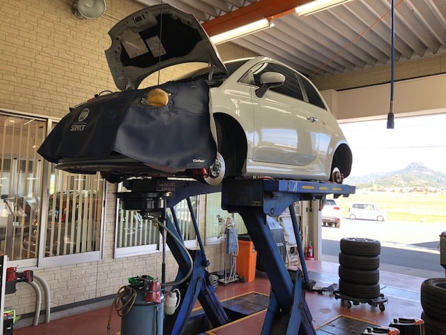 ABARTH595は点検入庫です。オイル交換を済ませて各部のチェック、タイミングベルトの亀裂が入ってきています。Witech...