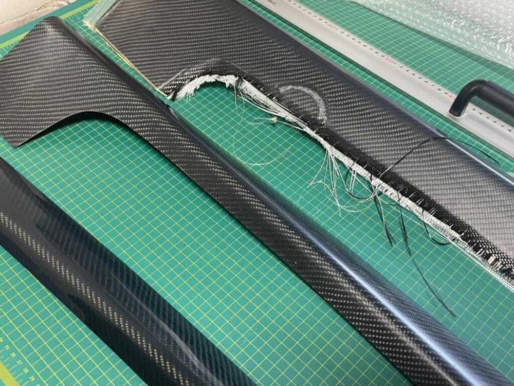 ハンドレイによるカーボンパネルのプロセスです。一番上の画像がカーボンパネルの成型後の状態。真ん中の画像が成型したパネルをカット...