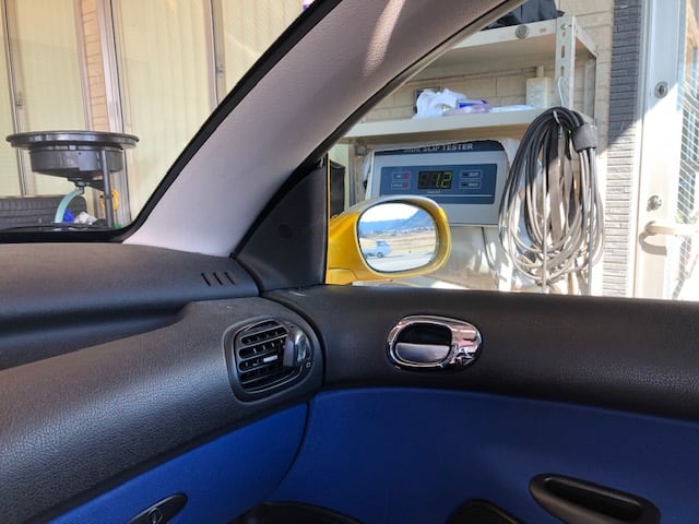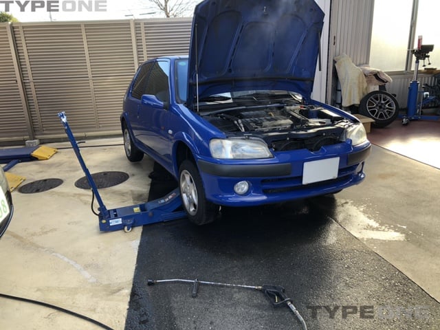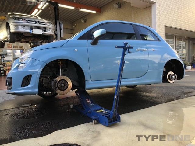 ABARTH500の車検スタートです。車高が低いのでジャッキで片方ずつ上げて下回りの洗浄を実施。水廻りも修理するのであらかじ...