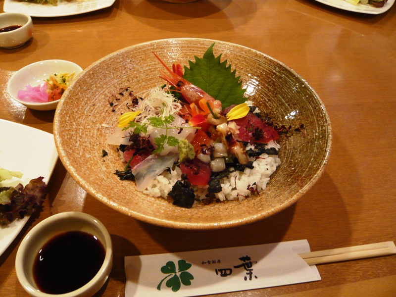海鮮どんぶりに牡蠣フライと大葉フライ、サラダ、