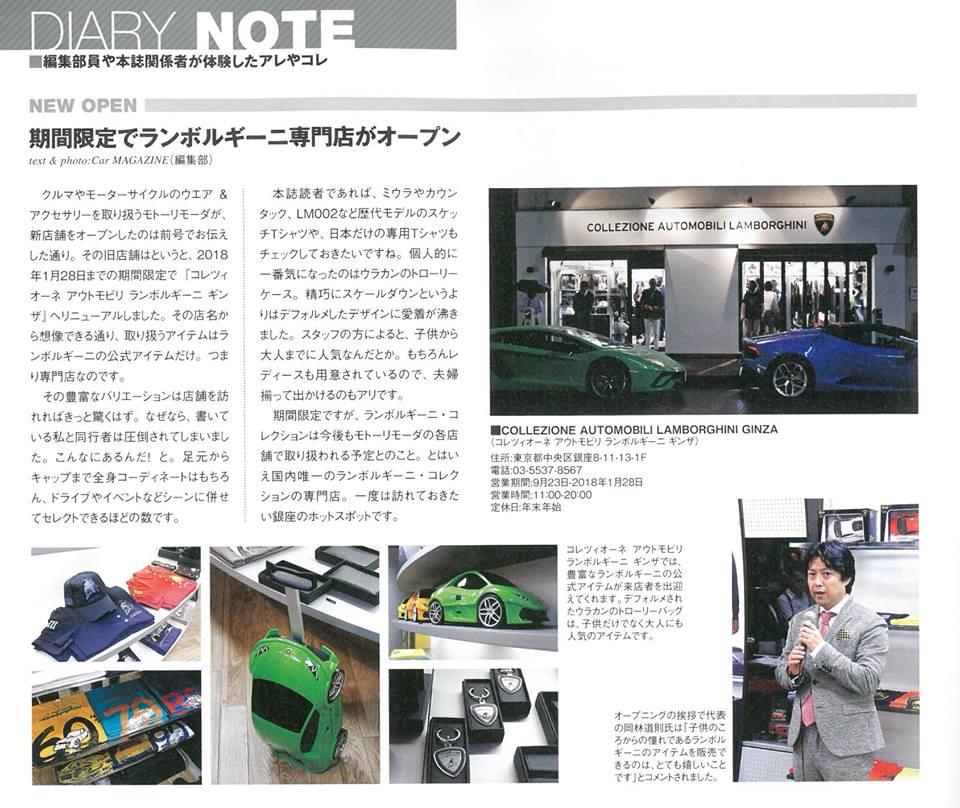 ・「CAR MAGAZINE」(10/26発売号)でCOLLEZIONE AUTOMOBILI LAMBORGHINI GINZAなどについてご紹介いただきました。
