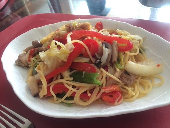 この日は土曜日のボジョレーパーティに嫁が作って出したチキンのアヒージョのオリーブオイルが大量に残っていたので、キノコと野菜のアーリオオーリオを作りました!