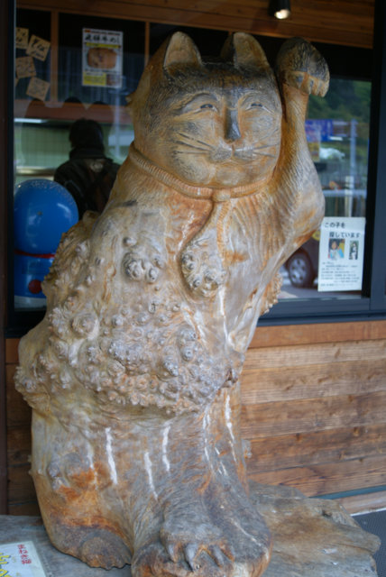 写真は、道の駅で見つけた木彫りの猫でございます。