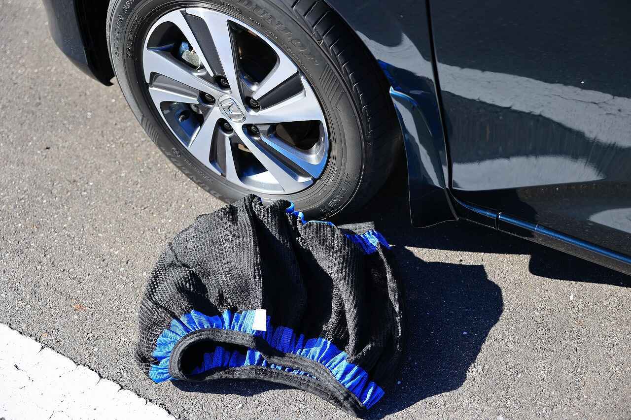 クルマを少し動かしてタイヤを半回転させ、もう半分をタイヤにかぶせ終了。