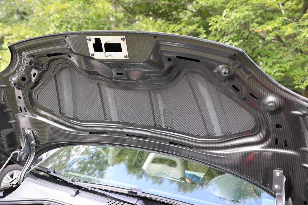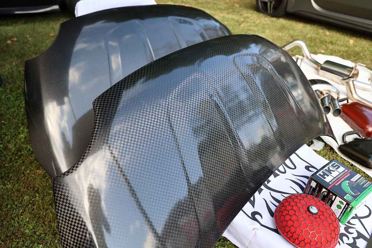 人気のドライカーボンボンネットは開繊仕様と綾織シンメトリー仕様を展示。裏側も妥協なき綺麗な仕上がりです。