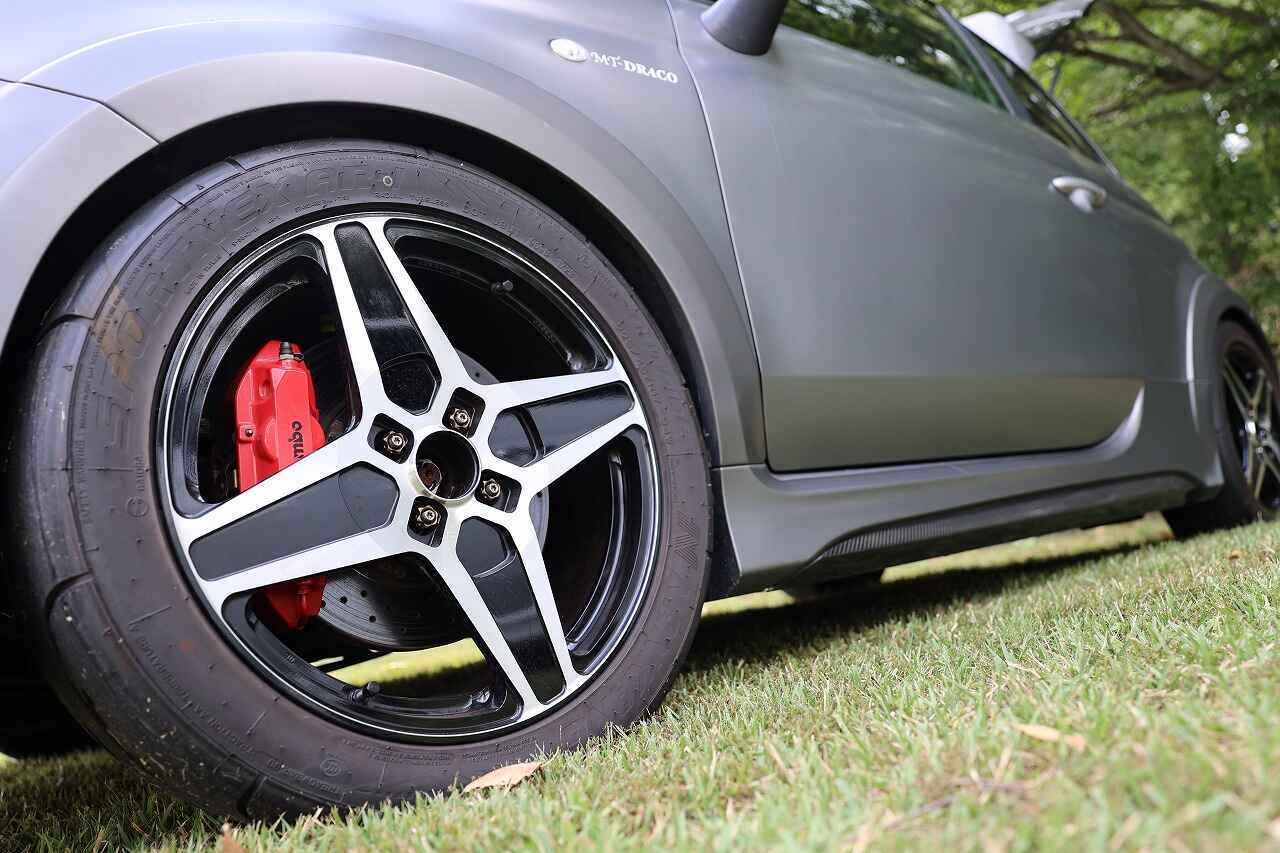 MT-DRACOお馴染みとなっている4本スポークの裂開鍛造ホイール。性能も折り紙つきですがカラーや表面のフィニッシュも豊富で、数が多いフィアット&アバルト500においてもオリジナリティを出せるパーツ。クラシカルですが現代のクルマにも合うデザインになっていますね。