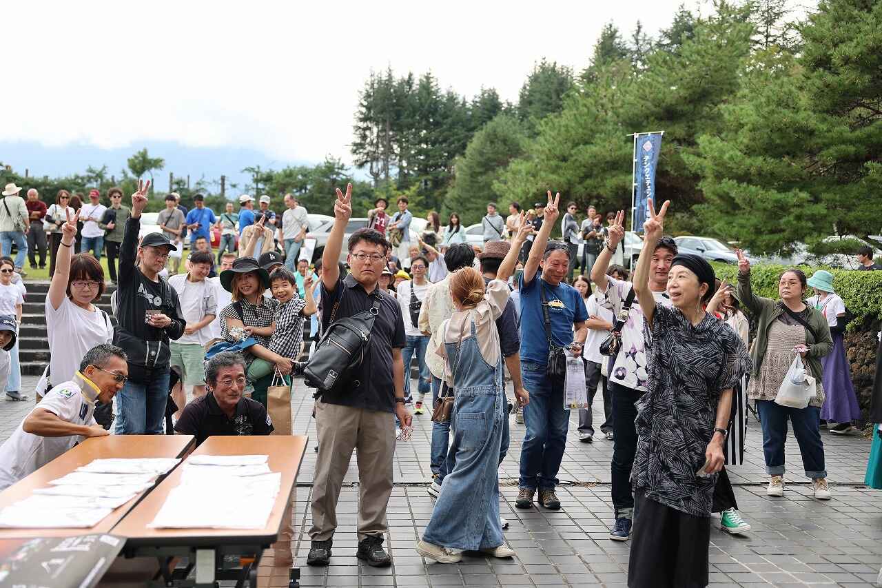 残念ながら背後にそびえるはずの富士山は出てきませんでしたが、緑に囲まれた会場は爽やかな空気に包まれ、集った参加者の皆さんは良い笑顔で記念撮影に臨んでいました。