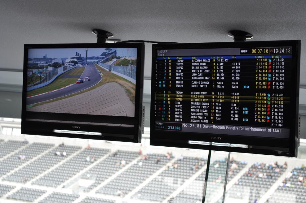 うわぁ、さすが鈴鹿サーキットともなるとメディアセンターが広い!目いっぱいモニターもぶら下がってる!