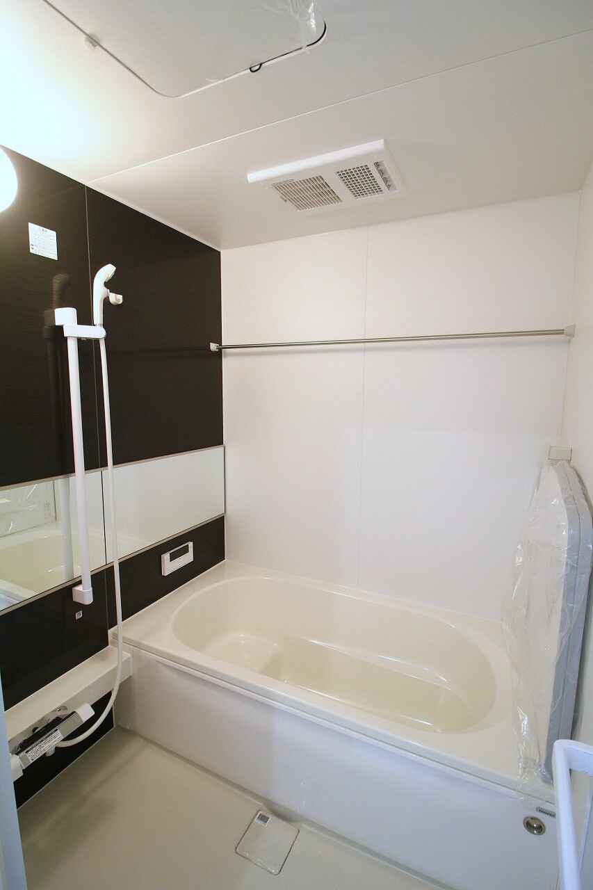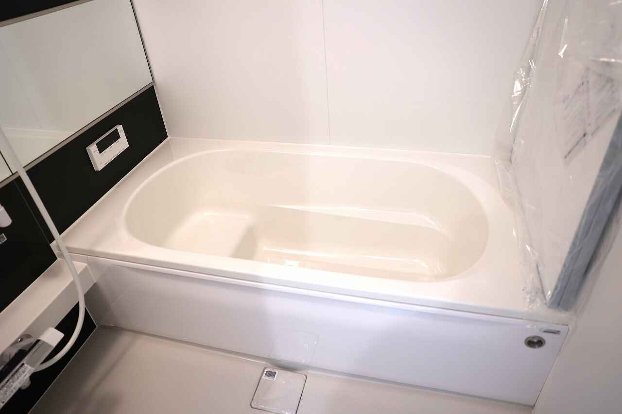 モノトーンでモダンな印象のバスルームは、戸建てやファミリータイプのマンションなどに用いられる”1616サイズ”。足を伸ばしてゆったり寛げる広々したバスタブを備えている。浴室乾燥機も完備。