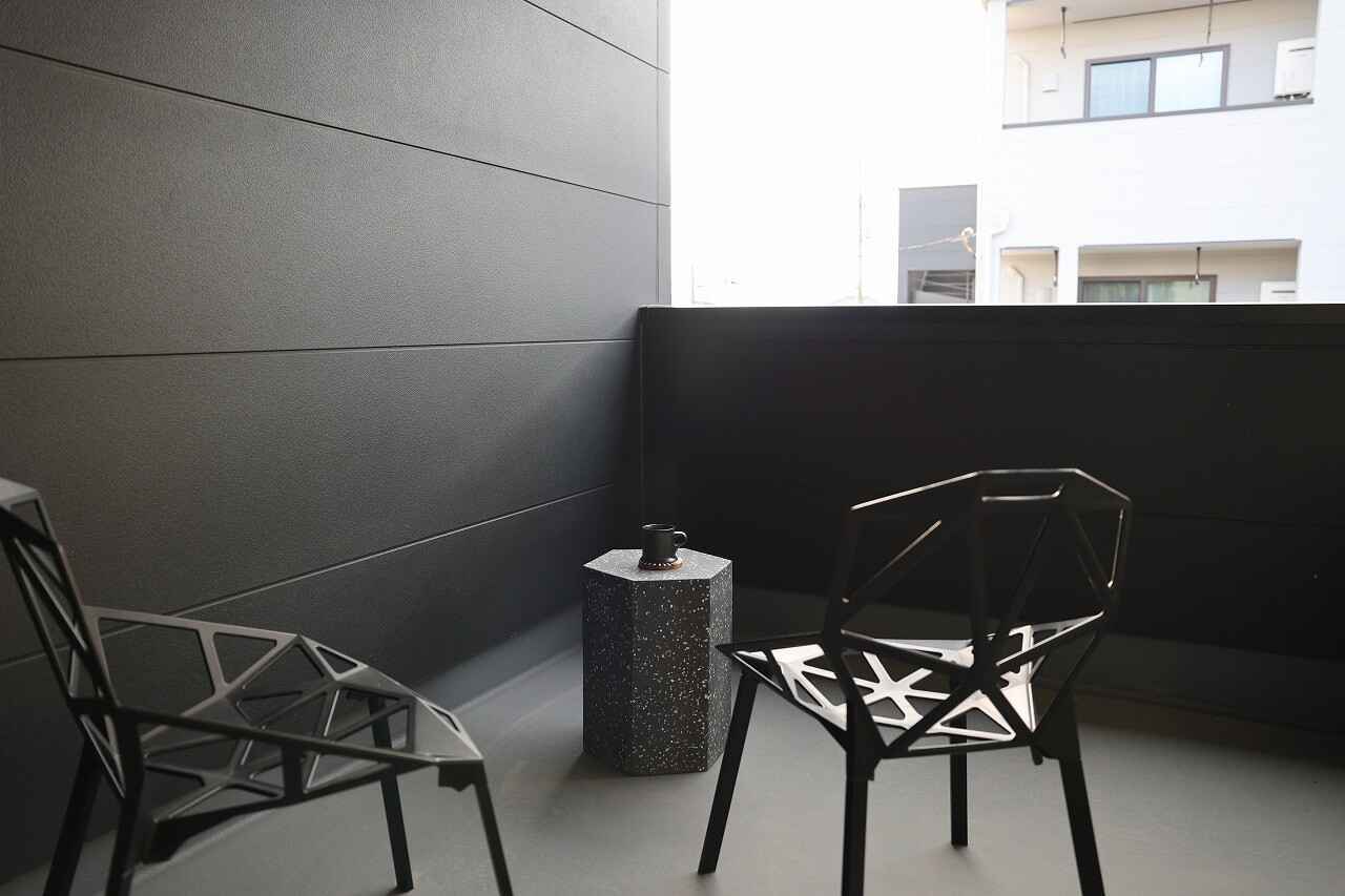 外観はブラックを基調としてシンプルながらスタイリッシュな印象。広い敷地内で通路を挟みA棟、B棟に分かれており、各棟3戸ずつ合計6戸あります。それぞれ1階がガレージスペース、2階が住居スペースとなっております。