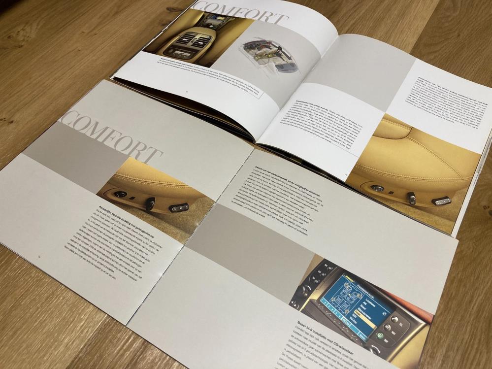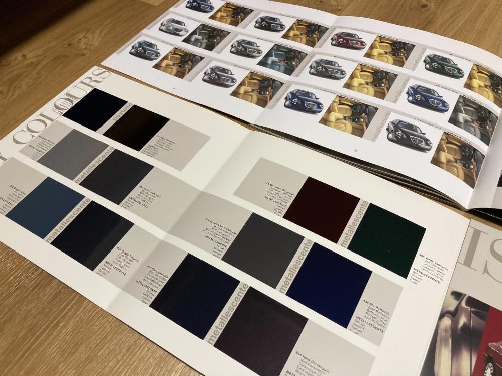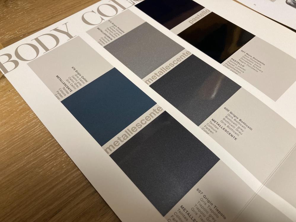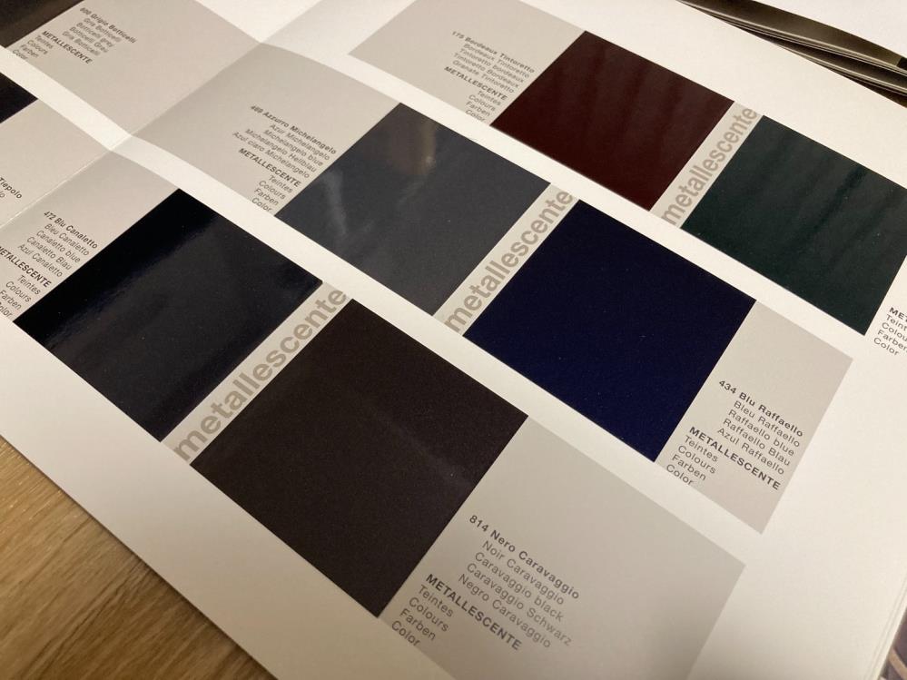 一番違うのがこちらのカラーチャート これまで持ってた英語版は本カタログ内で車の写真(イラスト)なのに対し、ドイツ語版は別冊の内外装カラーチャートになっており、外装色は以前紹介したイプシロンのカタログのようにプラ板のようなものが貼られてます。 これだと複数あるブルーやグレーの微妙な色味の違いもわかりますね。^_^