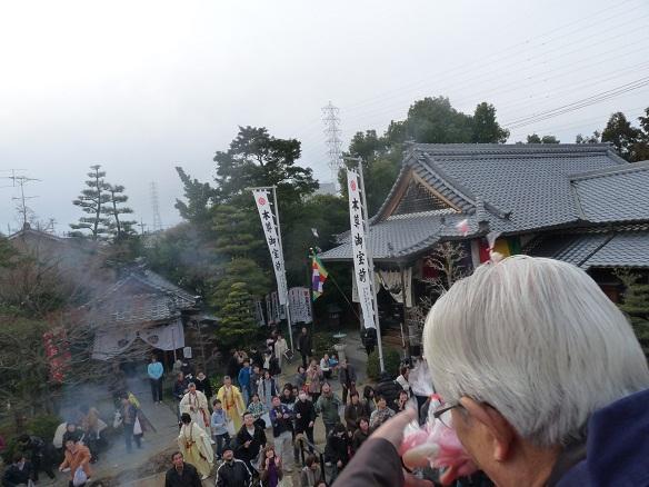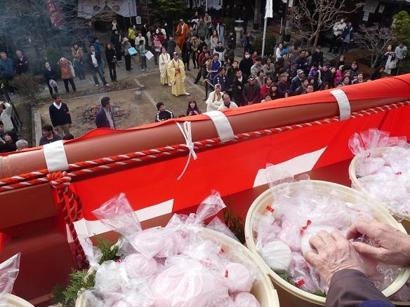 社務所二階のベランダに上がり、手元にある紅白のお餅を盛大にばらまくのですが、