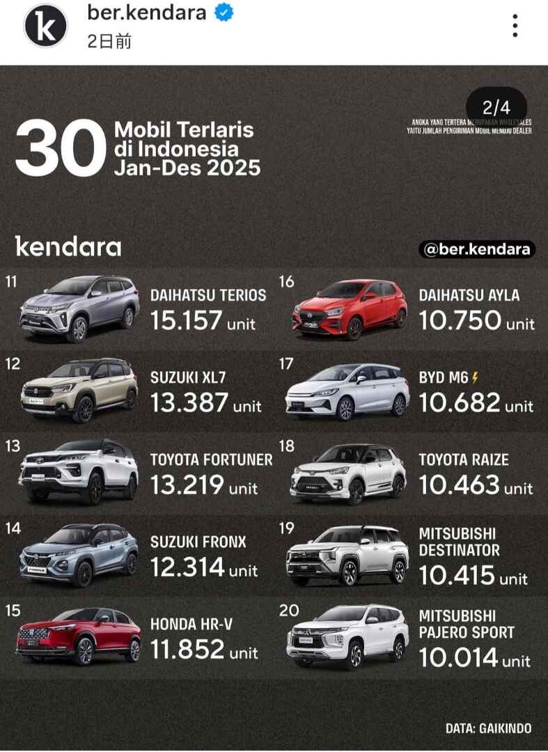 トヨタ/ダイハツのダブルブランドで売ってる車も多いのですが、合わせると1位はSigra/Calya 2位はAvanza/Xenia/Veloz 3位Rush/Teriosと小型の3列7シーターモデルが相変わらず人気ですね。