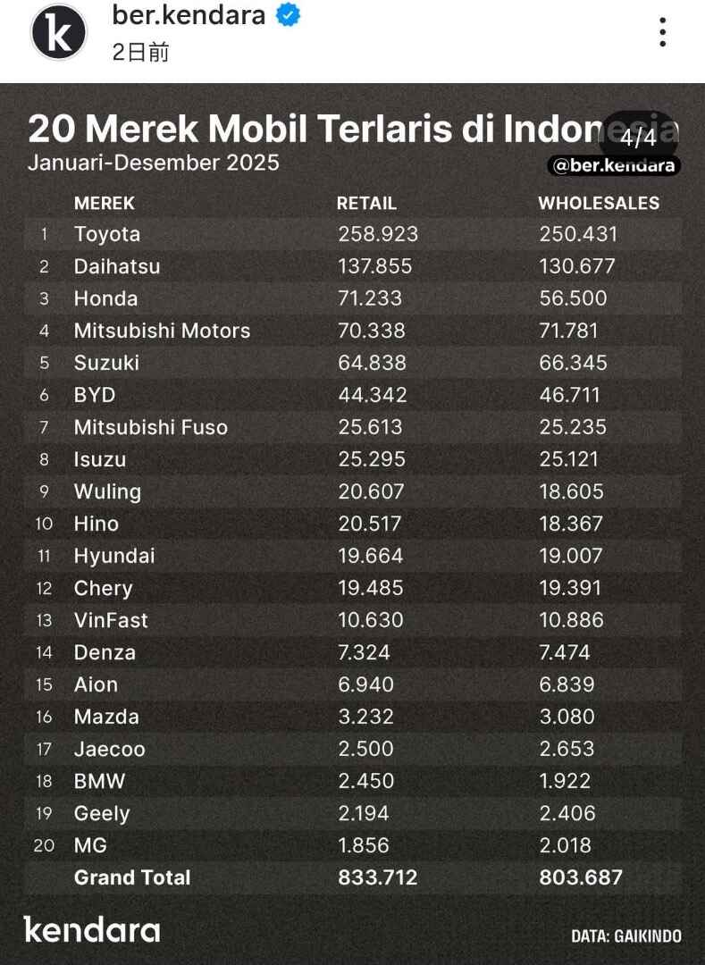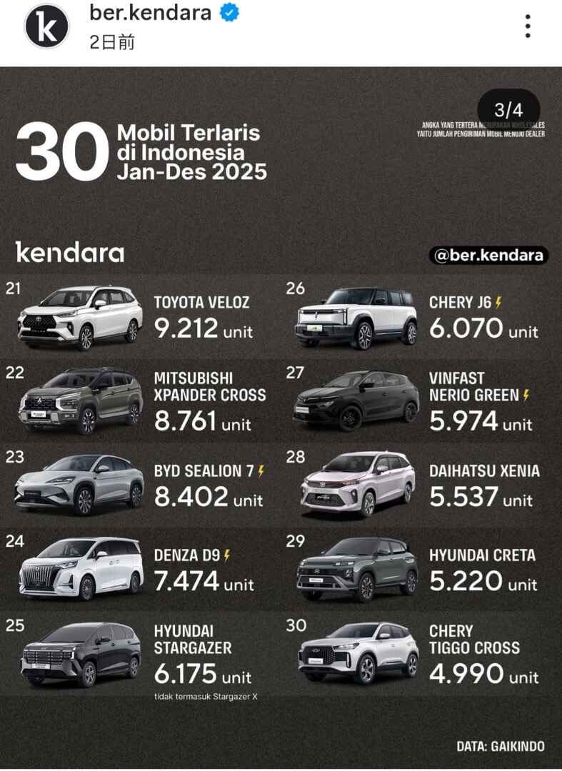 インドネシアの2025年の4輪車種別の販売台数ベスト30とメーカー別です。