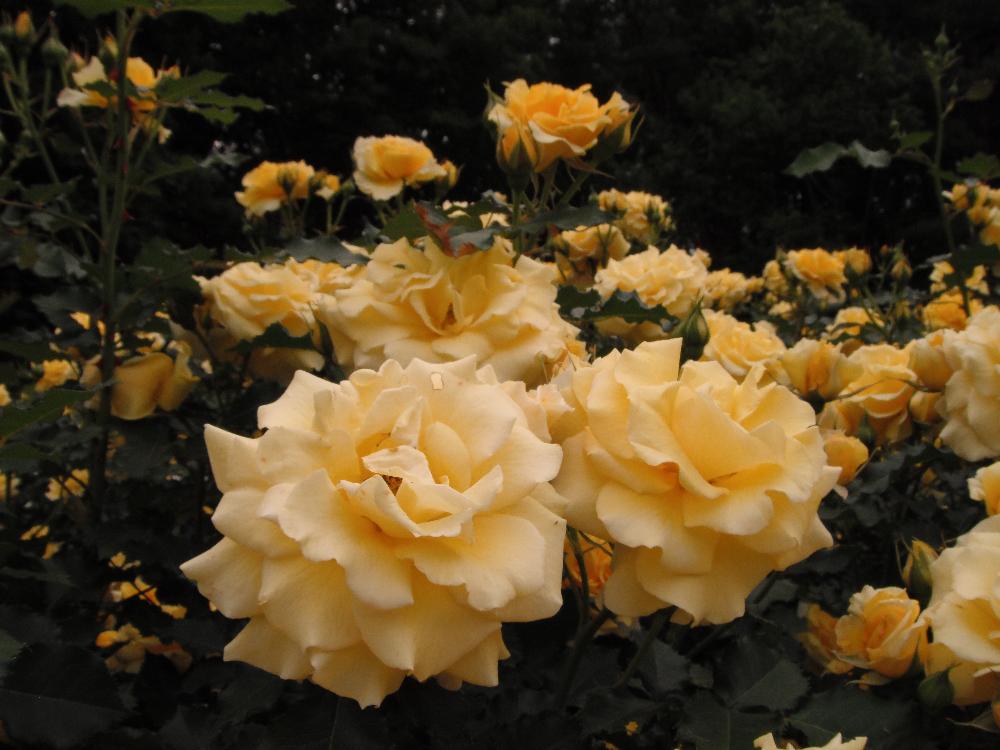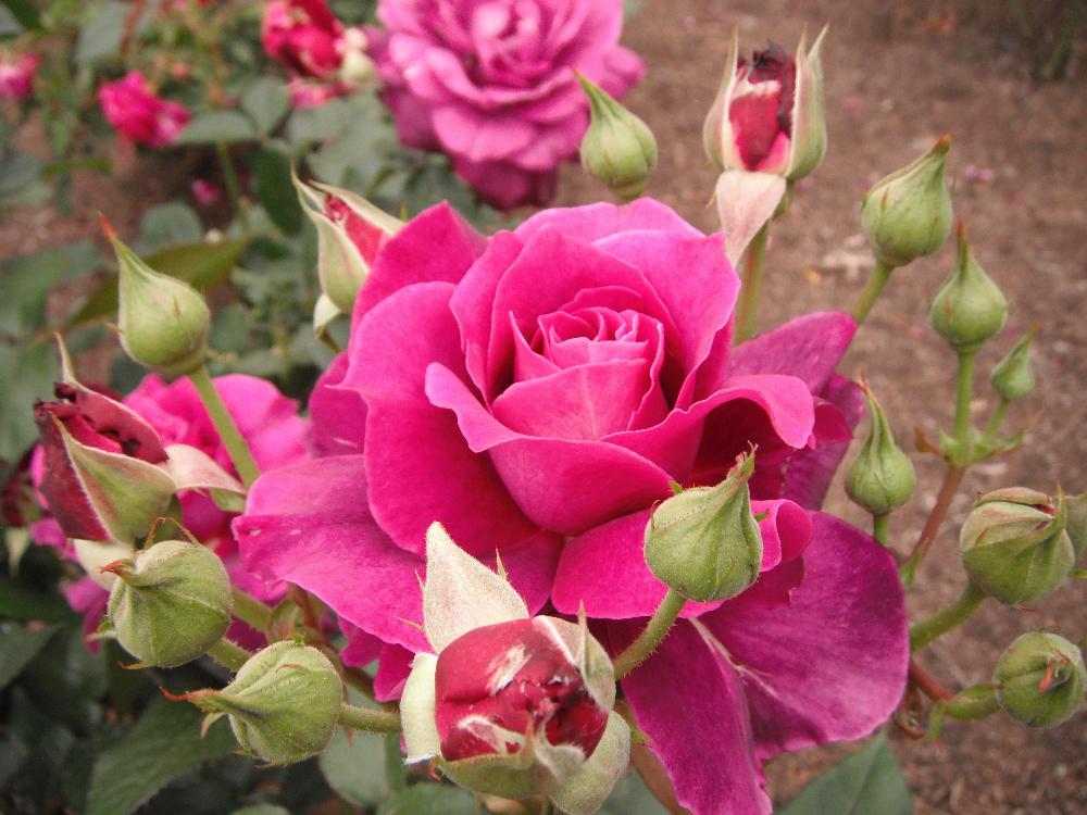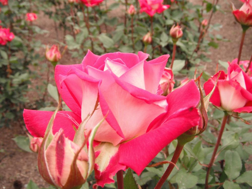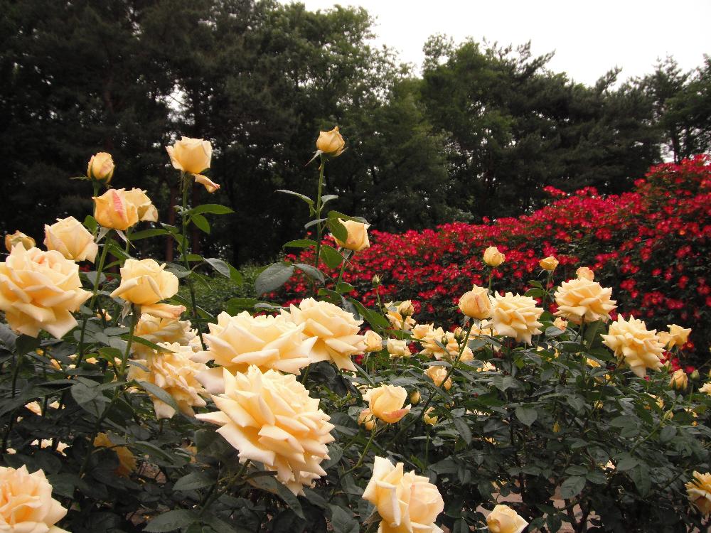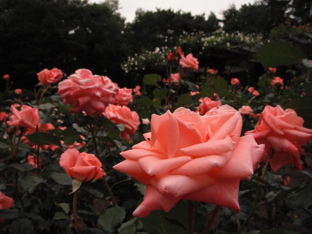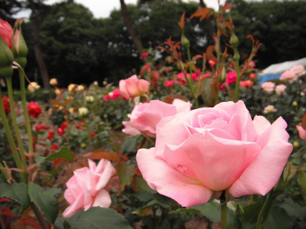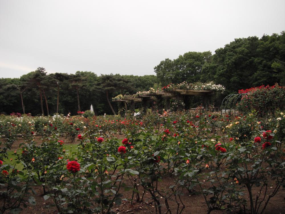 中央噴水を取り囲むようにして色とりどりの薔薇が咲いているのが遠くからもうかがえます。